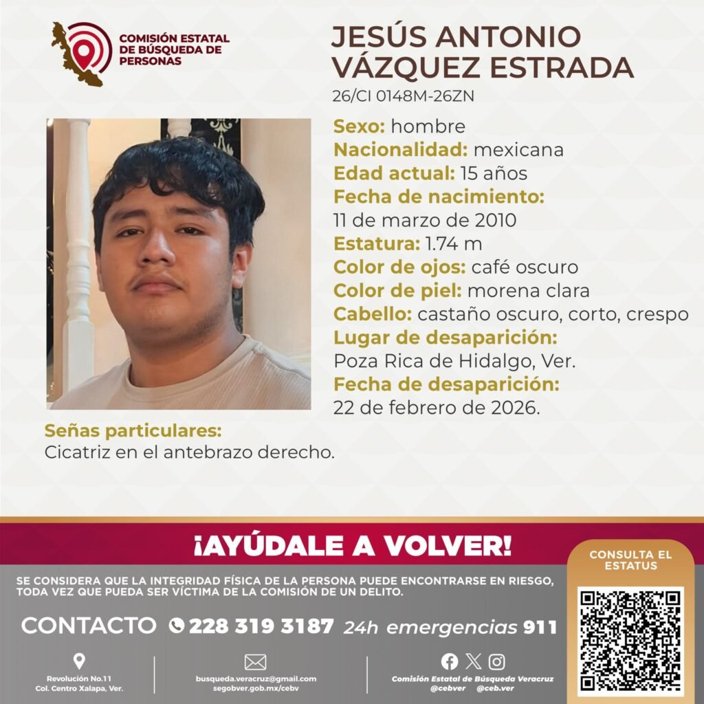 Desaparecieron cuatro jóvenes en municipios del norte de Veracruz entre el 16 y 22 de febrero de 2026, tres de ellos son adolescentes y uno es un joven adulto. La Comisión Estatal de Búsqueda activó protocolos de localización, pero hasta ahora no existe rastro de su paradero.